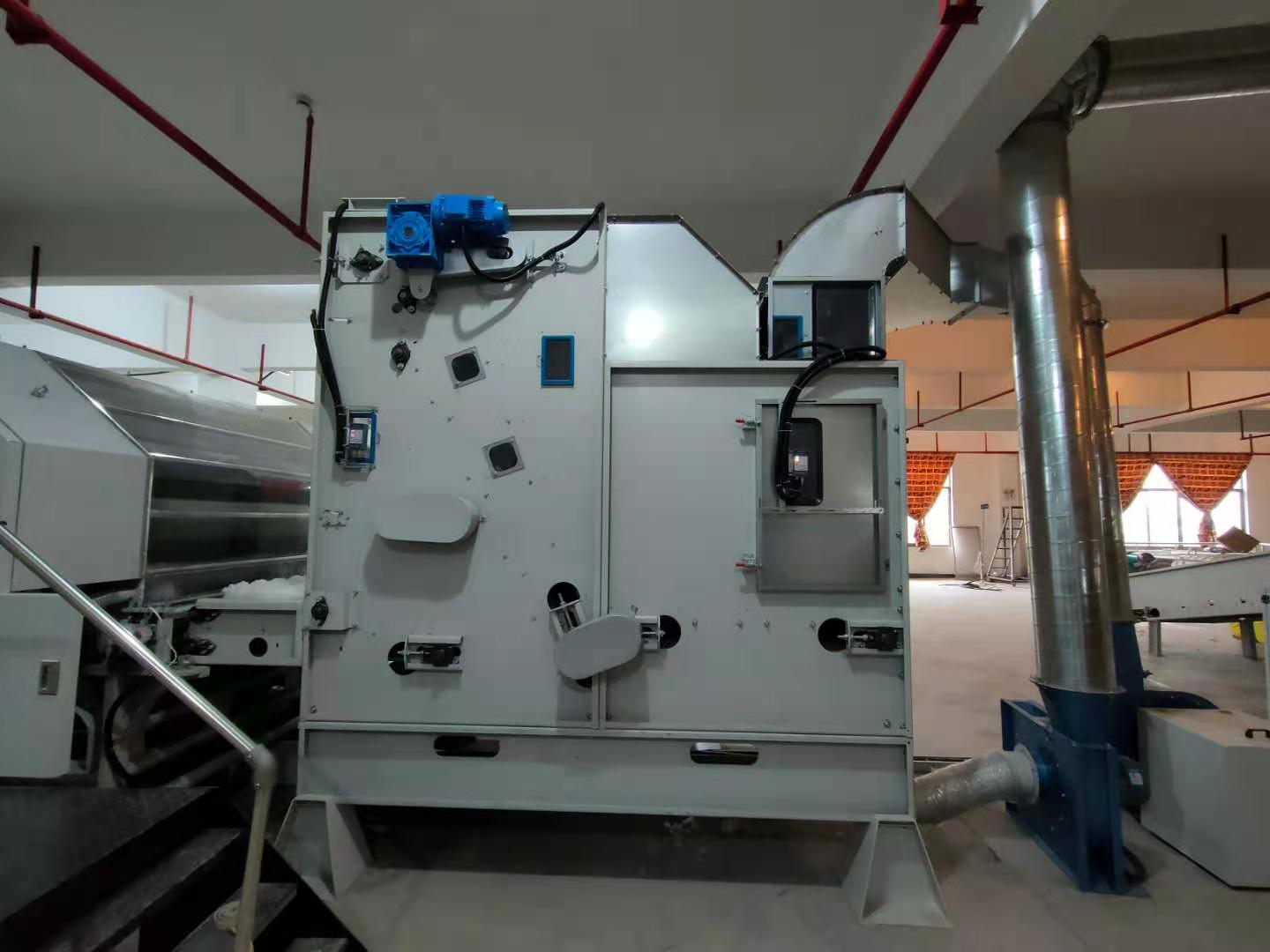 本生產(chǎn)線專為化纖填充被套的自動(dòng)化生產(chǎn)設(shè)計(jì),涵蓋從纖維梳理、填充物鋪網(wǎng)到被套封裝的全流程,具有高效、精準(zhǔn)、衛(wèi)生等特點(diǎn),適用于家紡、酒店用品、醫(yī)療寢具等領(lǐng)域的大規(guī)模生產(chǎn)。 化纖原料預(yù)處理 原料開松:將壓縮的化纖塊(如滌綸、PP棉等)通過開松機(jī)打散,形成蓬松狀態(tài)。 纖維梳理:通過高速梳理機(jī)將纖維梳理成均勻的網(wǎng)狀結(jié)構(gòu),確保填充物無結(jié)塊、厚度一致。 填充物鋪網(wǎng)與定型 交叉鋪網(wǎng)機(jī)將梳理后的纖維多層疊加,調(diào)節(jié)克重和蓬松度。 短程熱風(fēng)定型(可選):通過低溫?zé)犸L(fēng)穩(wěn)定纖維結(jié)構(gòu),增強(qiáng)回彈性。 被套裝配與封裝 自動(dòng)裁切:按預(yù)設(shè)尺寸切割填充層,匹配被套外殼。 充填裝套:通過充填機(jī)將纖維層均勻填入預(yù)制的被套外殼,避免分布不均。 絎縫/封口:采用多針絎縫機(jī)固定填充物,或通過超聲波封口機(jī)完成密封(防螨抗菌需求場(chǎng)景)。 質(zhì)檢與包裝 重量檢測(cè):確保每床被子填充量符合標(biāo)準(zhǔn)。 金屬探測(cè):排除生產(chǎn)過程中可能的金屬雜質(zhì)。 自動(dòng)折疊包裝:真空壓縮(可選)后裝箱。 高效率:全自動(dòng)化流程,日產(chǎn)量可達(dá)2000~5000床(視規(guī)格而定)。 精準(zhǔn)控制:PLC系統(tǒng)調(diào)節(jié)填充量、絎縫間距等參數(shù),誤差≤2%。 衛(wèi)生環(huán)保:封閉式填充環(huán)節(jié)減少粉塵污染,支持可回收化纖材料。 靈活適配:可快速切換不同被套尺寸(單人/雙人/加大)和填充克重。 智能分揀系統(tǒng):聯(lián)動(dòng)MES系統(tǒng)實(shí)現(xiàn)訂單批次管理。 抗菌處理模塊:在線噴涂抗菌劑(適用于醫(yī)療、兒童用品)。生產(chǎn)線概述