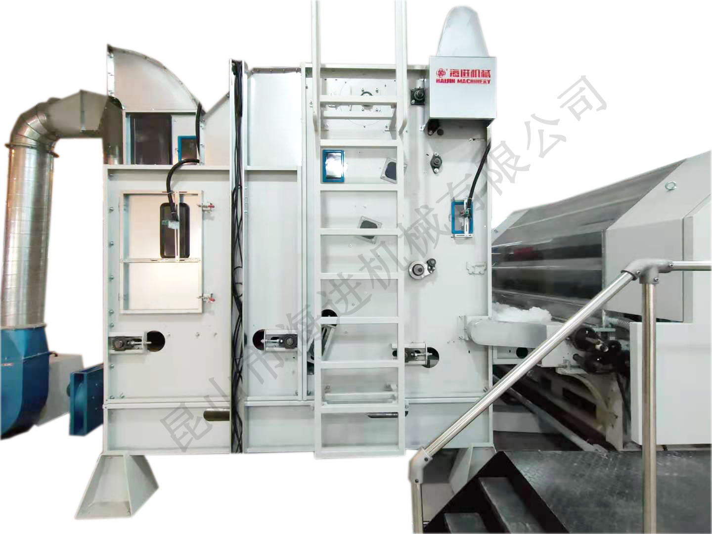 原料開松:將壓縮的化纖塊(如滌綸、PP棉等)通過開松機打散,形成蓬松狀態(tài)。